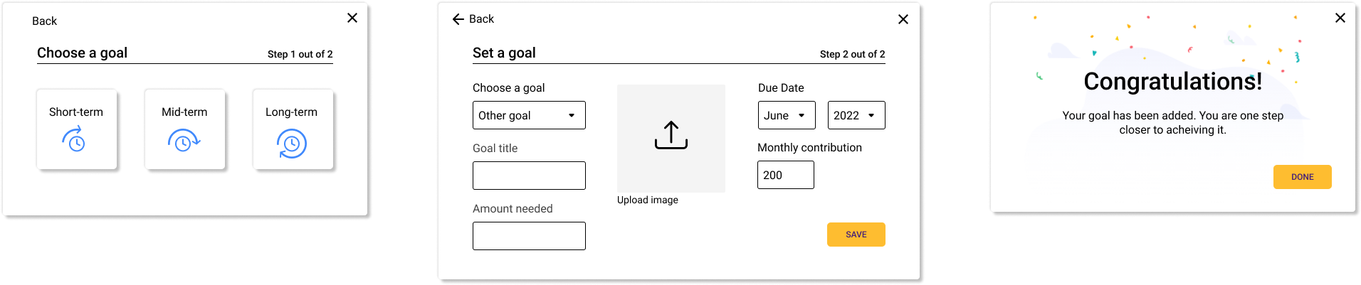 Taking into account time constraints for the development, during the 2nd iteration we combined all steps in one - the user is now able to select the goal term, choose a goal, and set the rest of the parameters on one screen. Also at the current stage, we eliminated the option to upload your own image to the goal, instead, the image is assigned automatically according to the goal type selected. However, we want to implement the image upload feature during the next stages of development.
